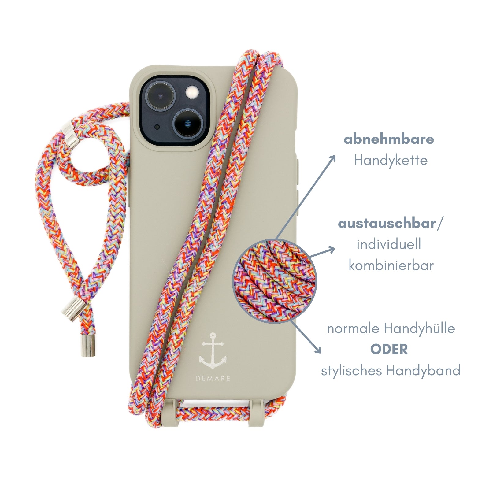 Unser DEMARE® smart Case bringt maximale Flexibilität: sie verbindet die schützenden Eigenschaften einer klassischen Schutzhülle mit der Flexibilität einer zusätzlichen Handykette. Du legst Wert auf ein stilbewusstes Auftreten und praktische Funktionalität im Alltag? Dann ist unsere stilsichere Handyhülle mit Kette genau das Richtige für dich. Entscheide ab sofort selbst, ob du dein Smartphone mit oder ohne Handyband verwenden möchtest. Ob crossbody oder über die Schulter: dank der praktischen 2-in-1-Funktion lässt sich deine Handyhülle innerhalb kürzester Zeit in eine stylische Handykette verwandeln – ideal für Festivals, City-Trips oder einfach für den Alltag.